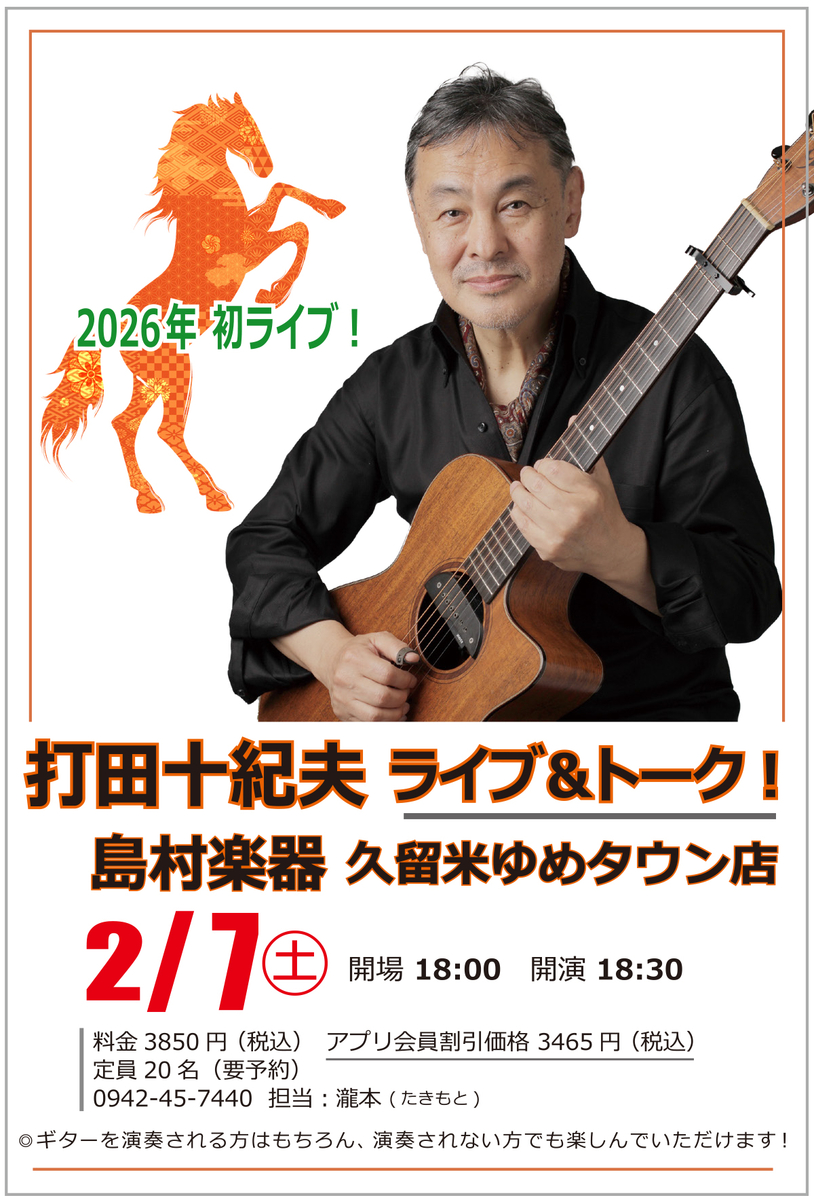 【ご案内】2026/2/7 (土) 打田十紀夫 “ライヴ&トーク” at 島村楽器・久留米ゆめタウン店
