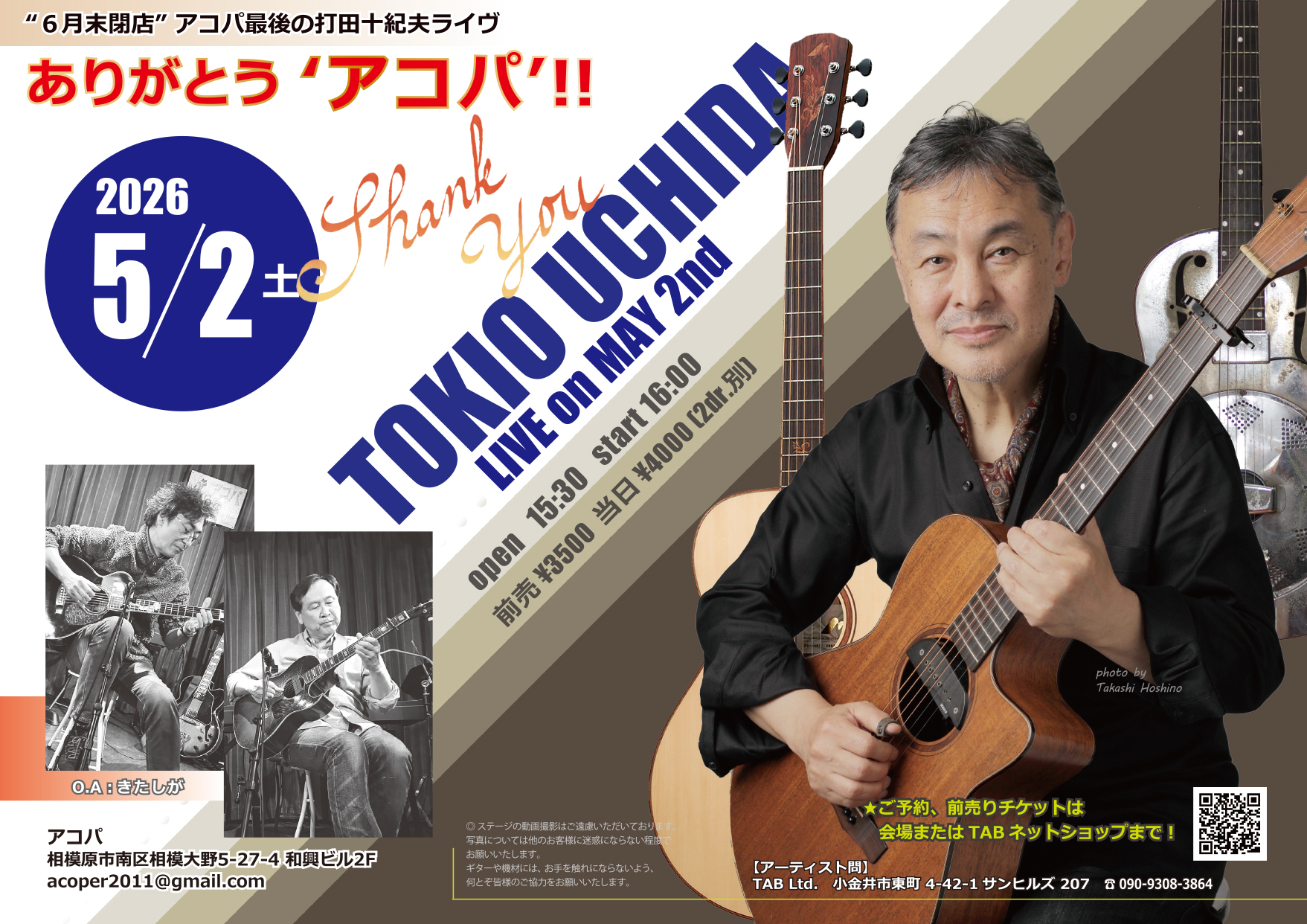 ますます円熟味を増したアコースティック・ギター・プレイと面白癒しトークの打田ワールドをご期待ください。皆様よろしくお願いいたします!オープニングアクトは、アコパでお馴染みの“きたしが”、長いキャリアのお二人の演奏も楽しみです。